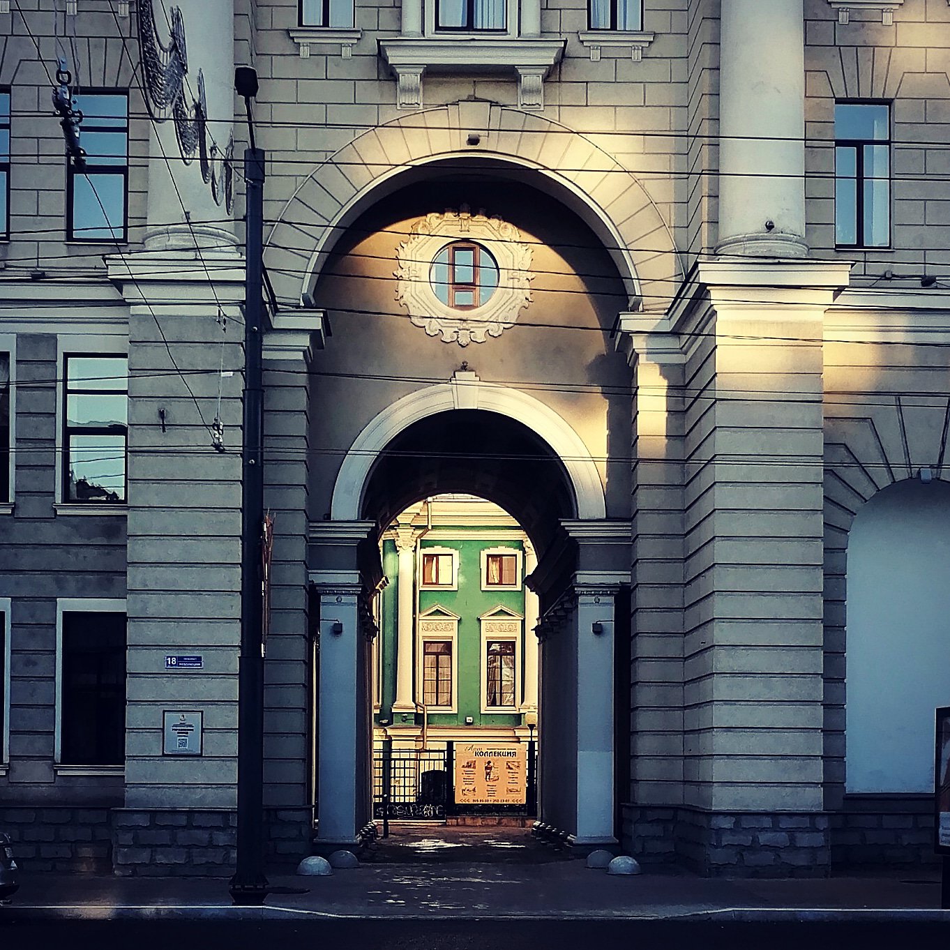 на первом плане здание Управления ЮВЖД в г. Воронеже, построенное в стиле сталинского ампира. В арке находится музей им.Крамского, построенное в стиле елизаветинского барокко