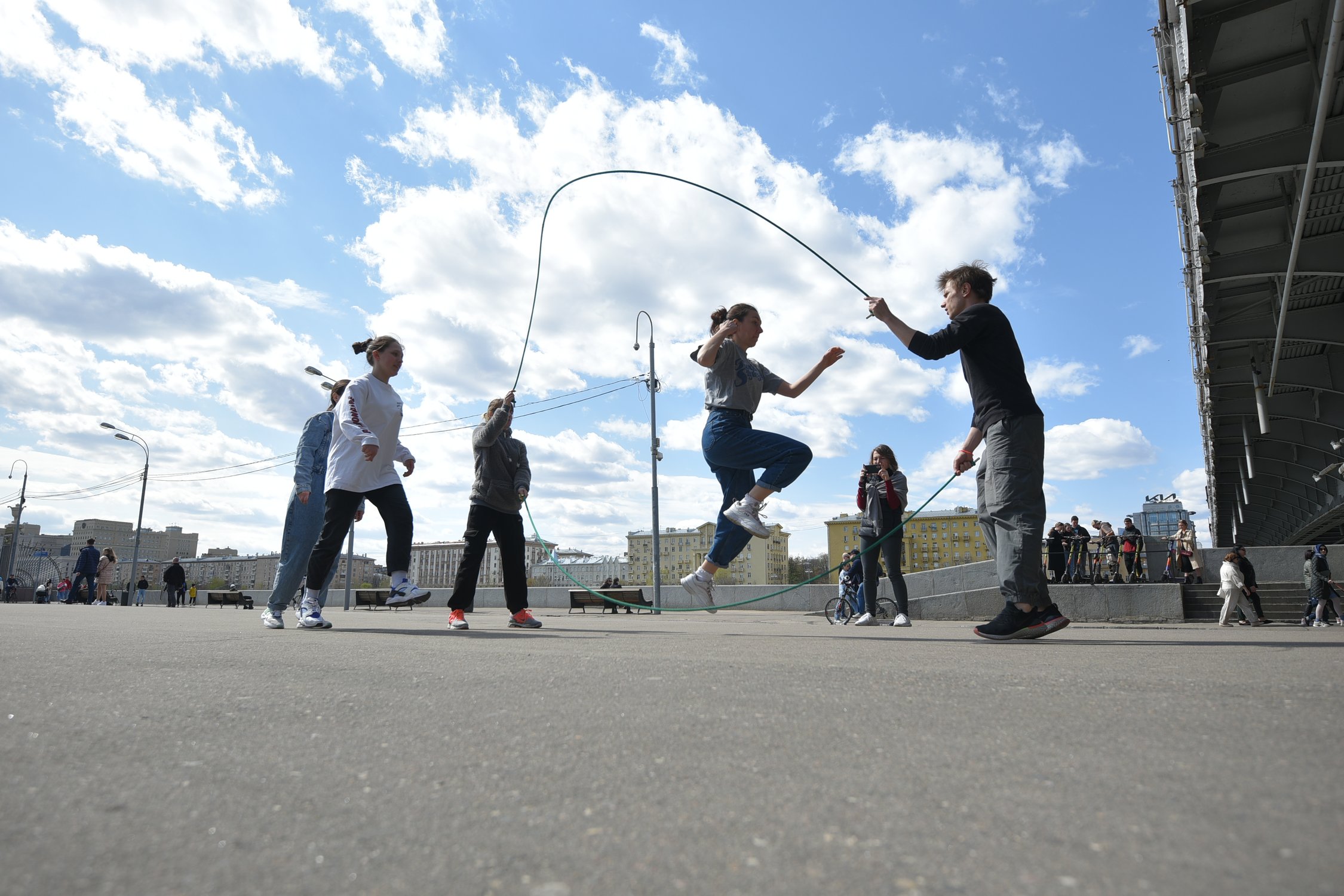 молодые люди прыгают через скакалку