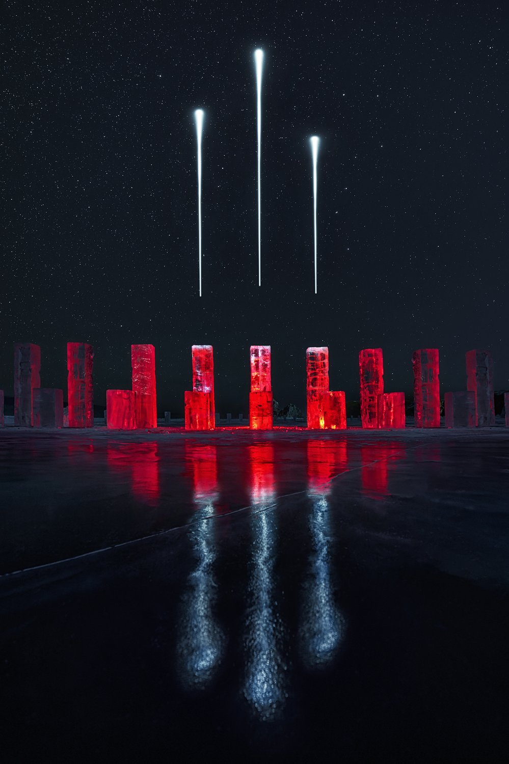 Байкал, заготовки ледяных скульптур, подсвеченные rgb-панелями, вертикальные треки выполнены дроном с подвешенным на нем фонарем.