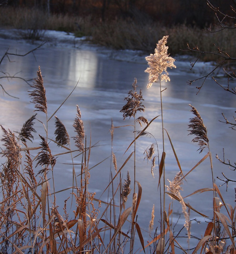 У речной заводи камыши купаются в лучах золотого солнца
