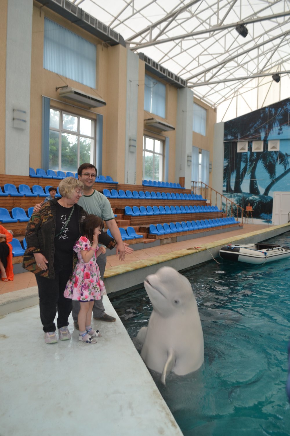 А ещё летом мы впервые за пять лет съездили в отпуск, на Кавказ! И в День Рождения сводили дочку в дельфинарий! С трёх лет она мечтала стать океанологом. Читала о дельфинах и касатках, рисовала морских и океанских животных. Какое счастье, когда мечты сбываются! На фото муж, дочка и моя свекровь, подарившая нам эту возможность.