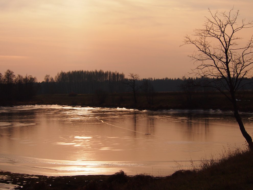 Закатные лучи уходящего солнца скользят по зеркальной поверхности льда заводи...