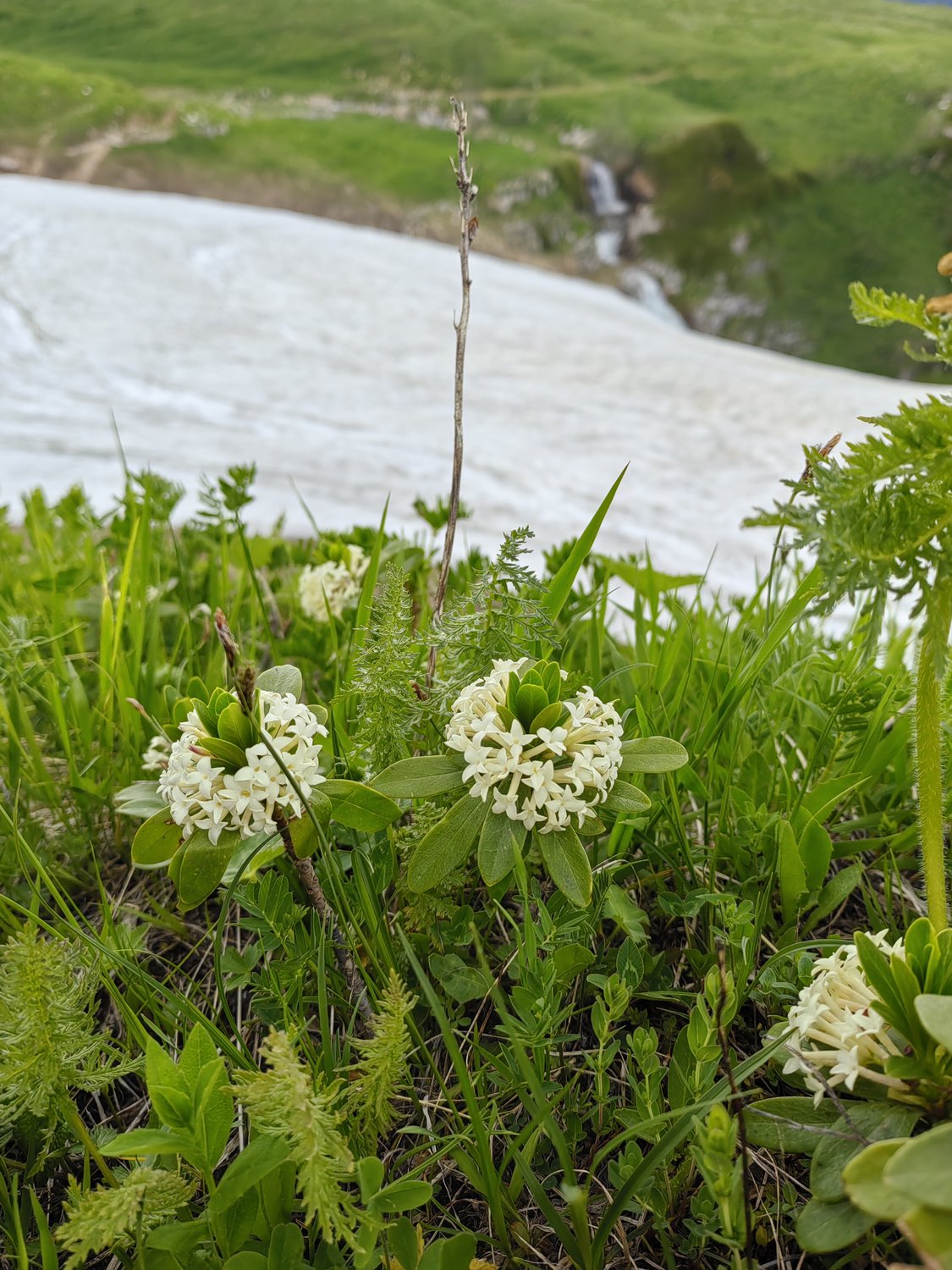 В начале лета на плато Лаго-Наки можно увидеть одновременно сочную зелень, цветущие альпийские луга и снежники. Вот, где поистине, встречаются два таких разных времени года: теплое лето и холодная снежная зима. Фото сделано на плато Лаго-Наки, июнь, 2024 год.