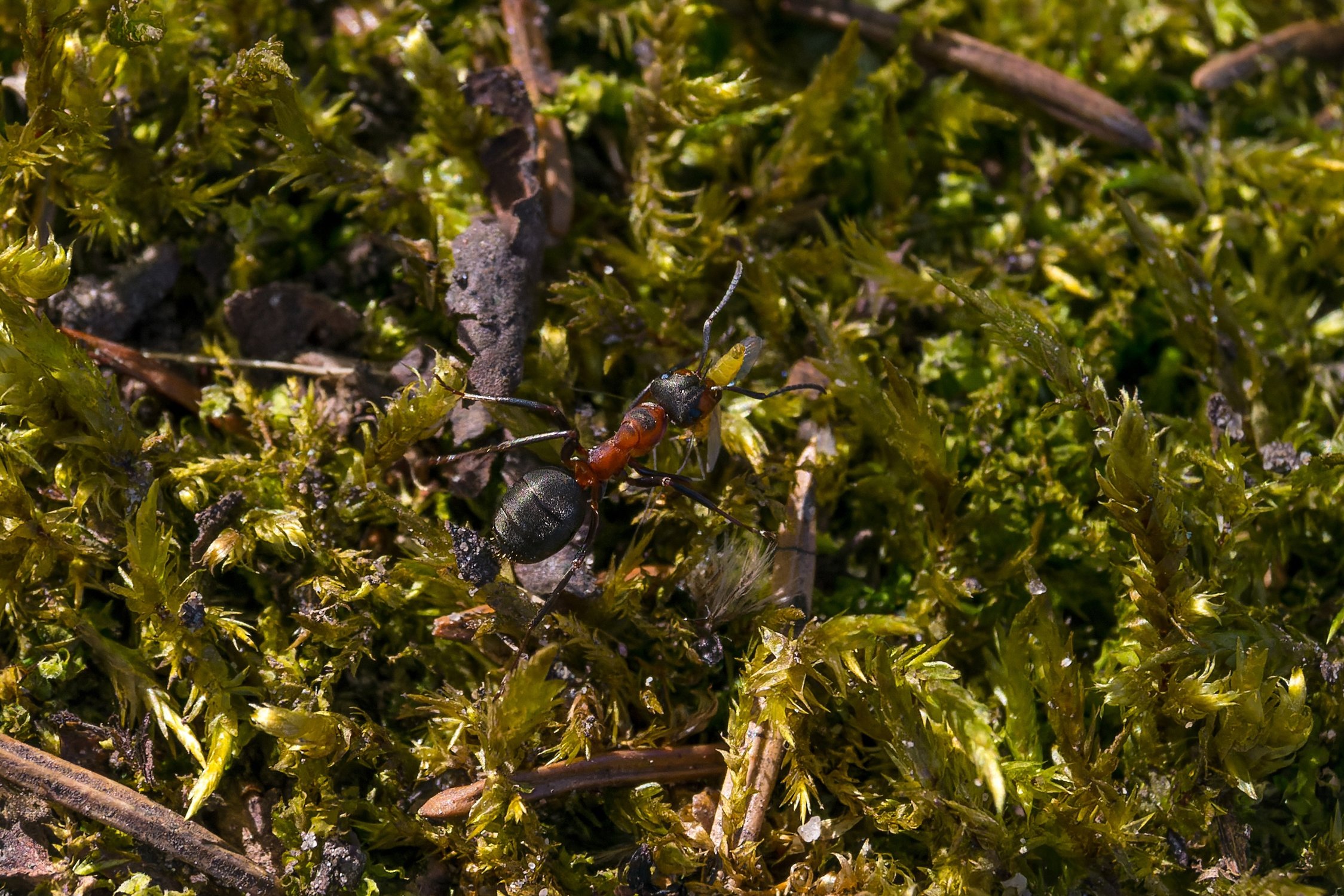 Рыжий лесной муравей несёт мошку.