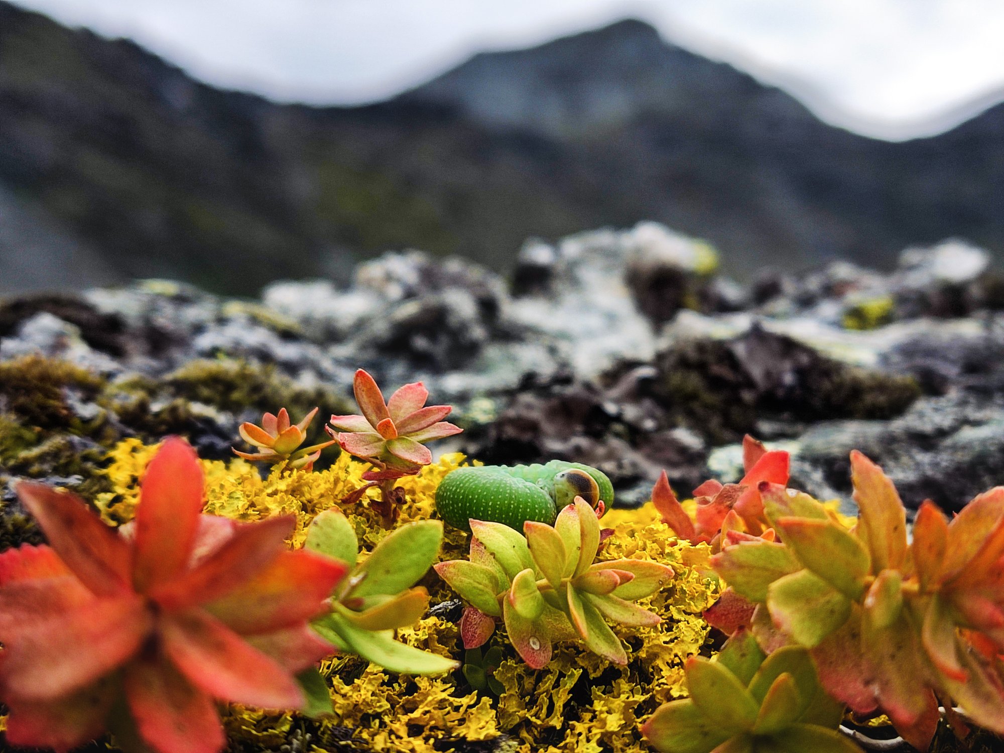 Маленькая гусеница уснула на фоне высочайшей вершины природного парка Ергаки - пик Араданский - 2466 н.у.м. Фотография сделана в походе по Араданскому хребту Западного Саяна в августе 2024 года.