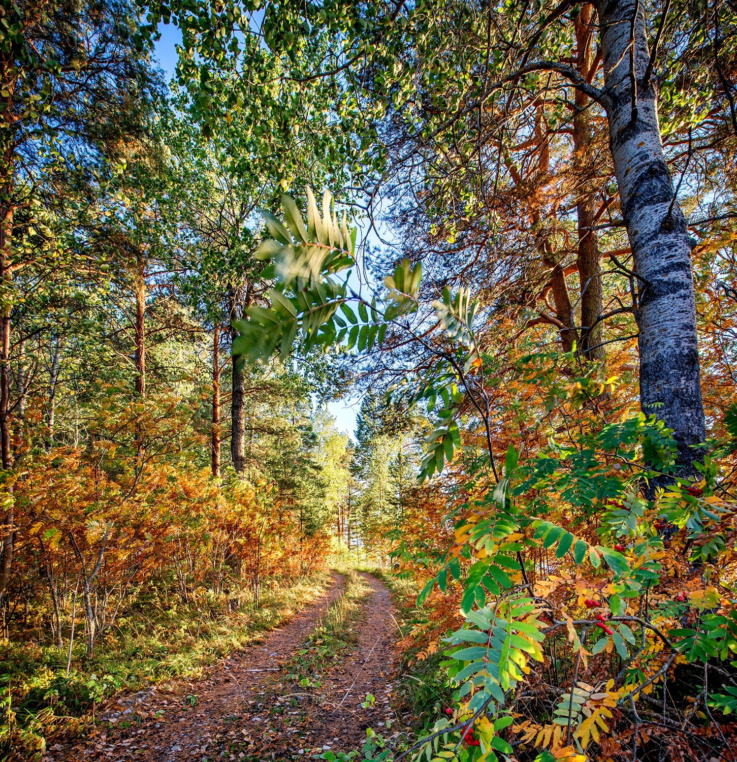 Лесная дорога в Заонежье. Яркий солнечный ветреный теплый день и палитра осенних красок.