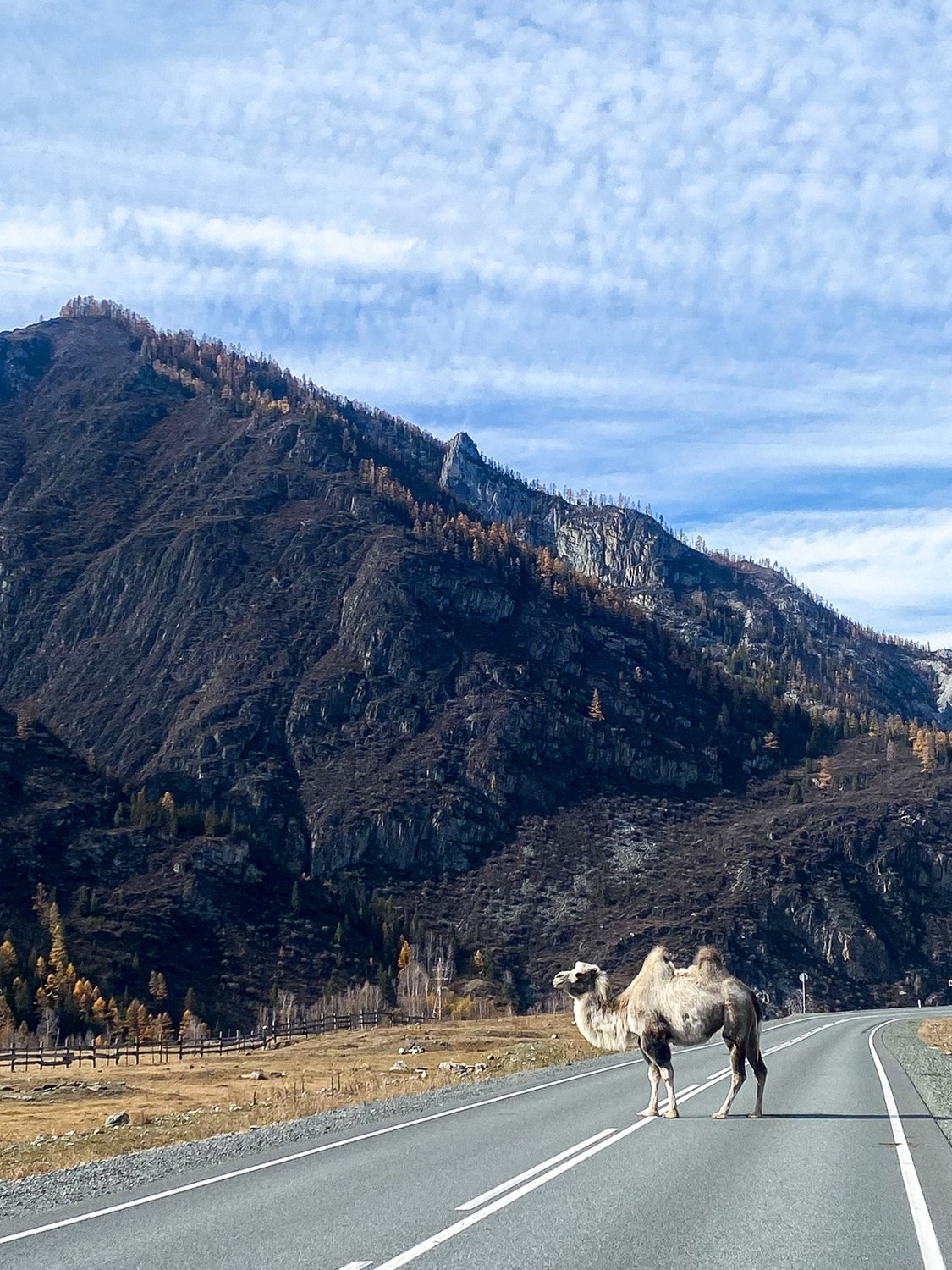 Да, свободный жираф, гуляет вдоль Чуйского тракта среди горных массивов, не боится машин и людей, интересуется всем и позирует для лучшего кадра.