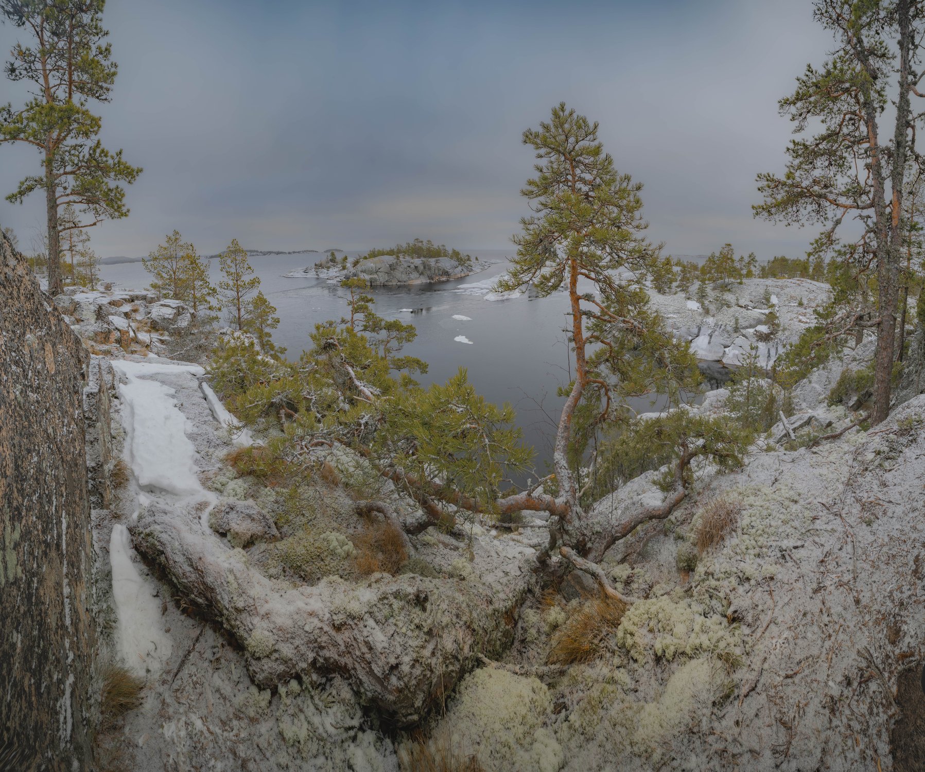 Обледенелые скалы ладожских шхер едва припудрены свежевыпавшей ледяной изморосью на рассвете
