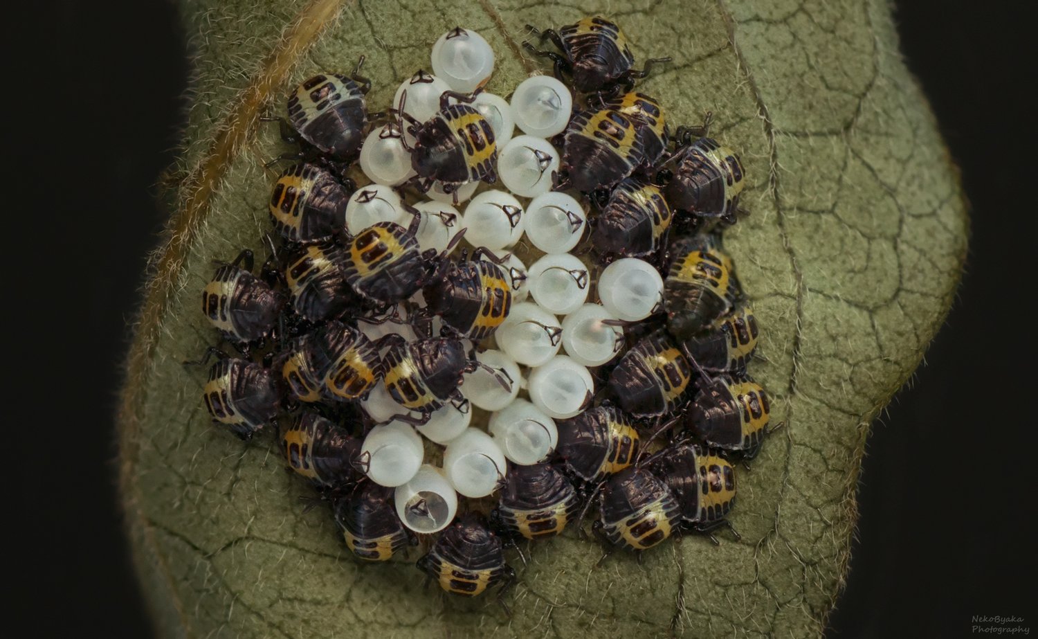 Личинки мраморного клопа на кладке. Мраморный клоп (Halyomorpha halys) — вид насекомых из семейства клопов-щитников Pentatomidae отряда полужесткокрылых.