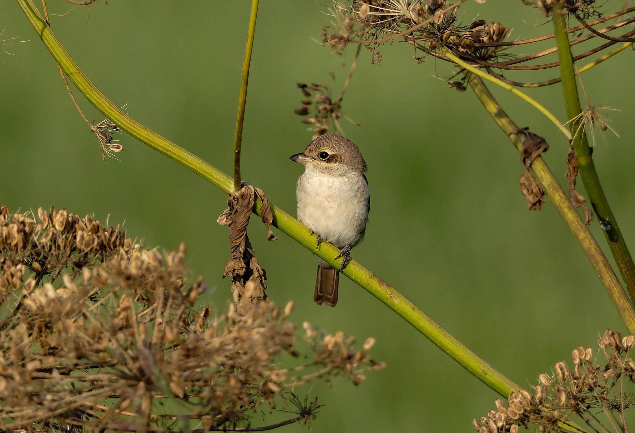 Молодой жулан-сорокопут на высохшем борщевике в закатных лучах, Санкт-Петербург.