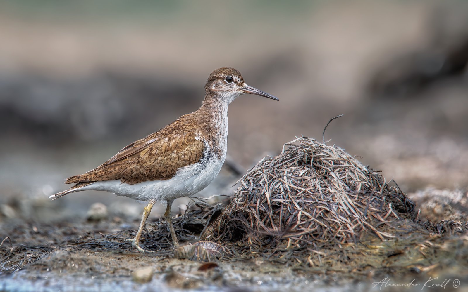 Перевозчик (небольшой, размером со скворца, куличок) в поисках пропитания в выброшенных на берег водорослях.