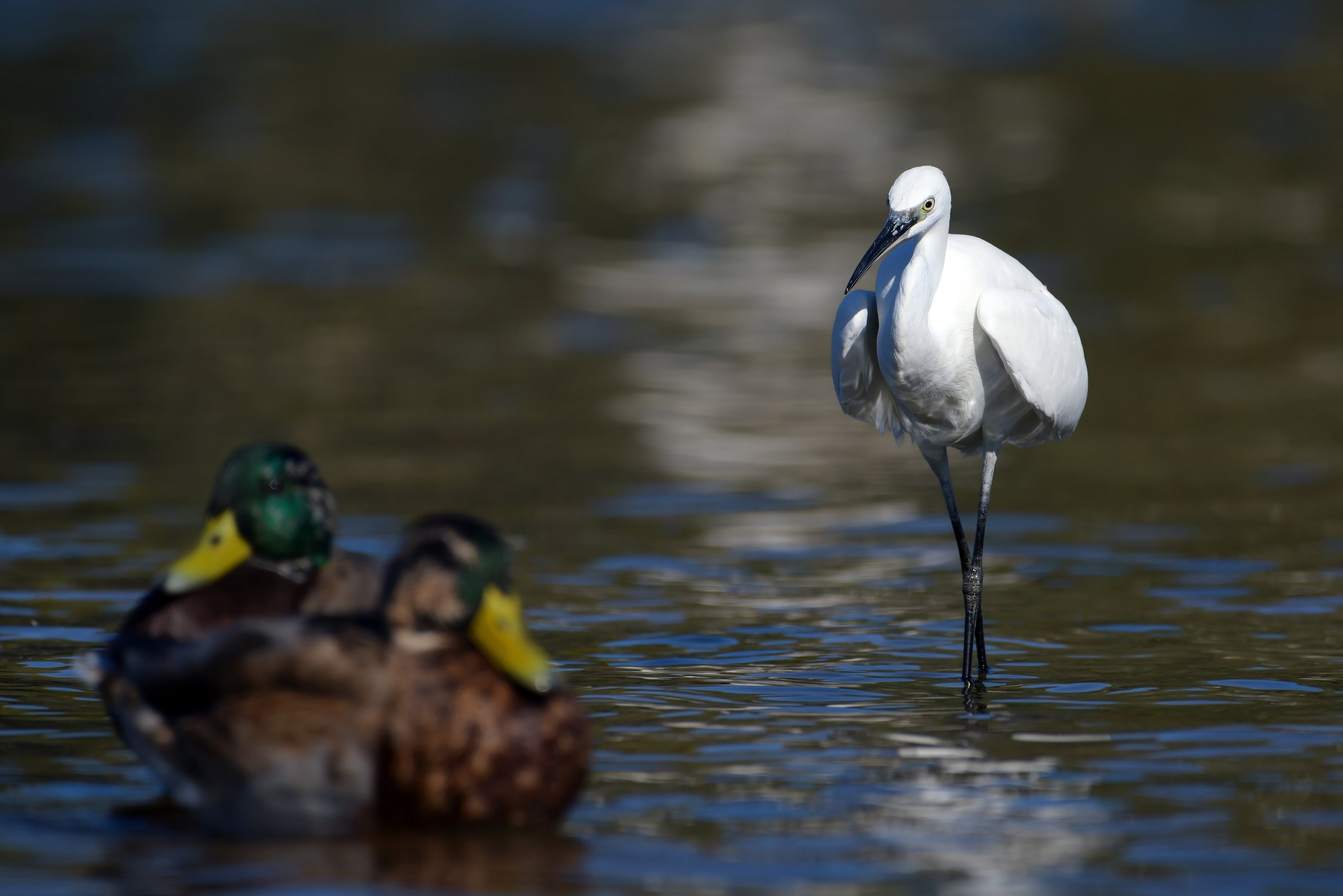 Малая белая цапля во время охоты поглядывает на крякв