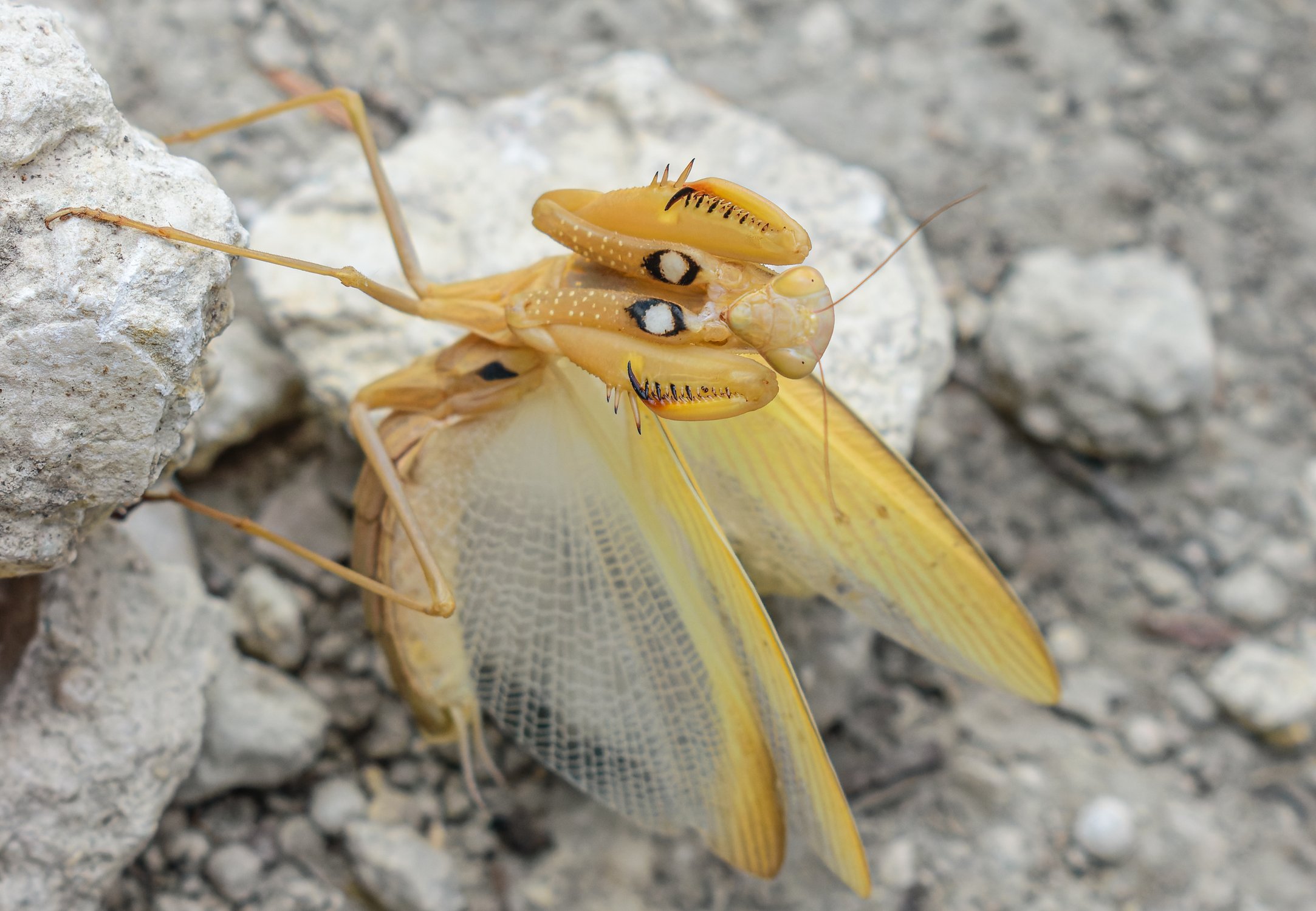 На моей фотографии из поста горизонт не завален. Когда я потянула руку к богомолихе, она, взобравшись на камень, начала меня пугать. И я сразу передумала.