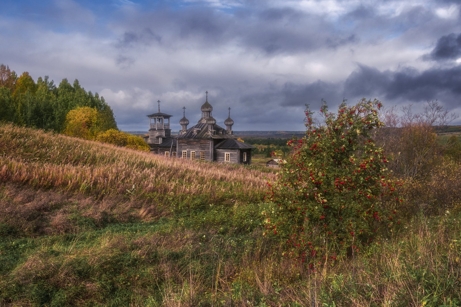 Осеннее Заозерье (Кельчемгора). Деревянная красавица церковь Николая Чудотворца 19 век. Архангельская область.