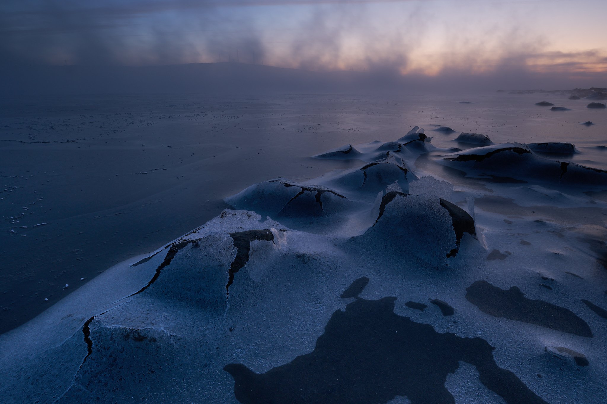 Во время отлива тонкий слой льда оседает на камнях, превращаясь в ледяные короны. А парение реки добавляет драматизма и магии