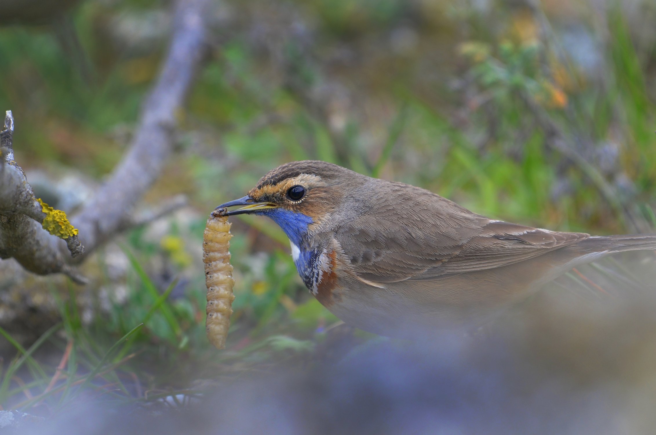 Самец варакушки поймал гусеницу oзимой совки.
