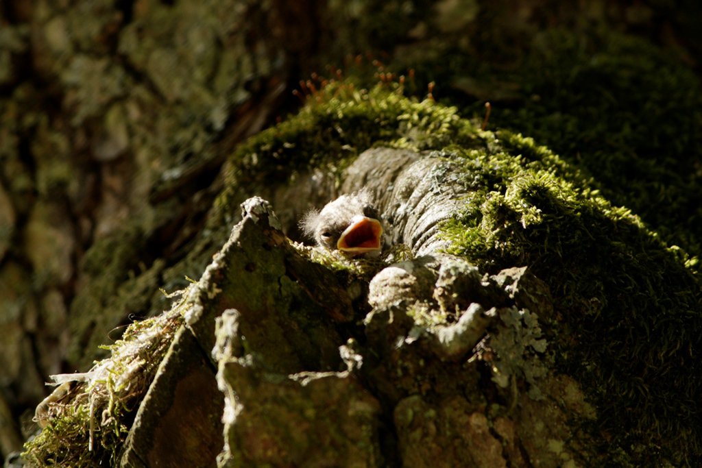 Национальный парк "Куршская коса",Калининградская область. Птенец серой мухоловки в возрасте 3 дней. Гнездо расположено в дупле черной ольхи на высоте 2,5 метров. Дата фотографии 02.07.2015.