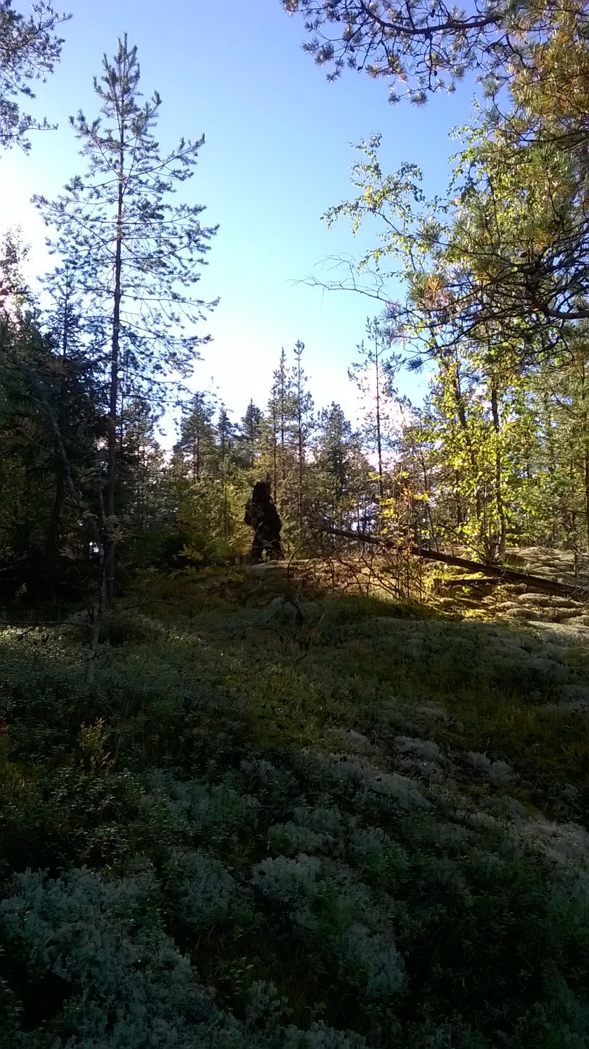 Собирал бруснику неподалеку от озера в районе Кузнечного. Увелекся. Вдруг чувствую чье-то присутствие. Поднимаю глаза - неподалеку большая фигура напоминающая человеческую. Не помню как сделал один кадр. Хотел подойти поближе, сфотографировать еще кадр, но когда приблизился - на том месте уже никого не было.