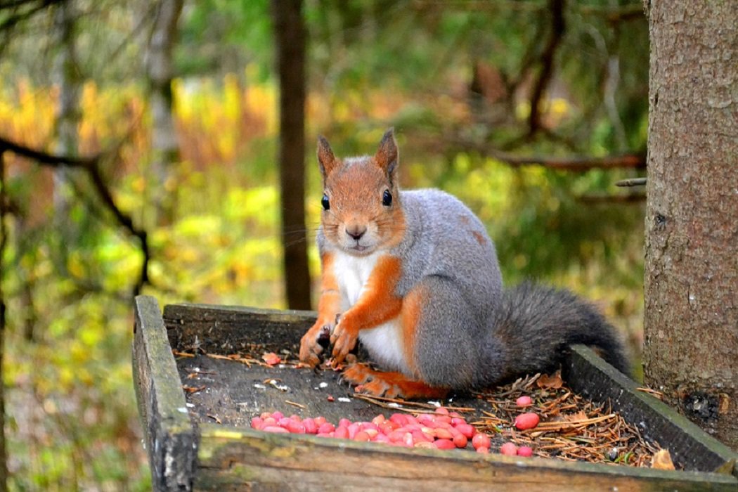 Семьей гуляли в лесу и встретили белочку. Накормили её орешками. Урал, Березники.