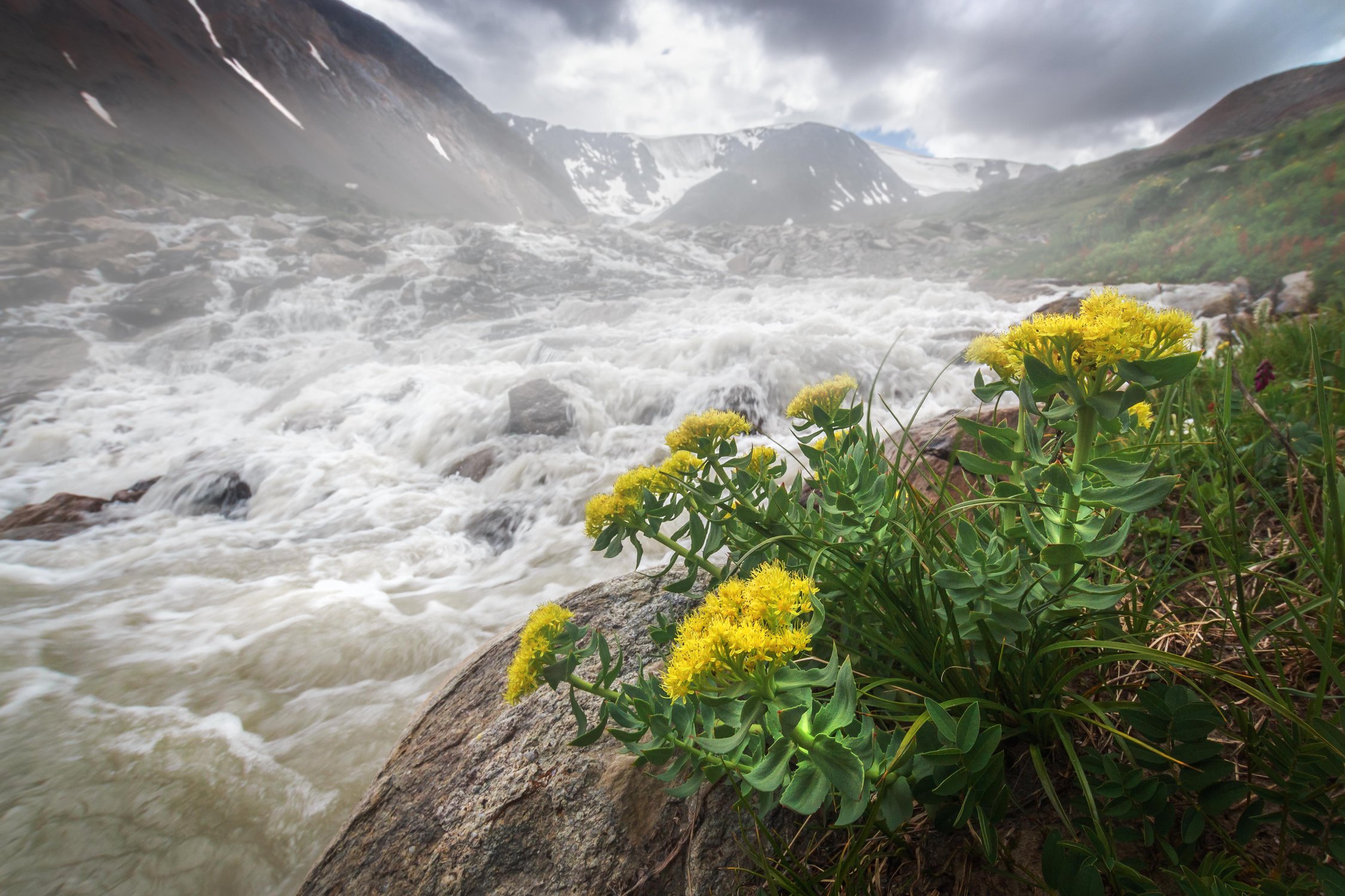 Rhodiola rosea (Родиола розовая) и река Тетё, Северо-Чуйский хребет, Алтай.Июль 2016 года.