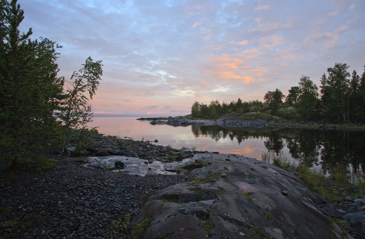 Карелия. Путешествие по Ладожским шхерам летом 2016г. Наша первая стоянка на полуострове Хуннука. Весь день шел дождь, но к вечеру небо прояснилось.