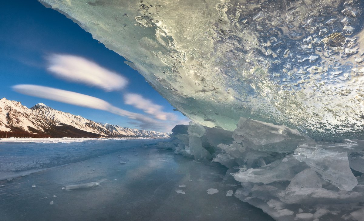 Взгляд из под торосов на Байкальский хребет. Байкало-Ленский заповедник.