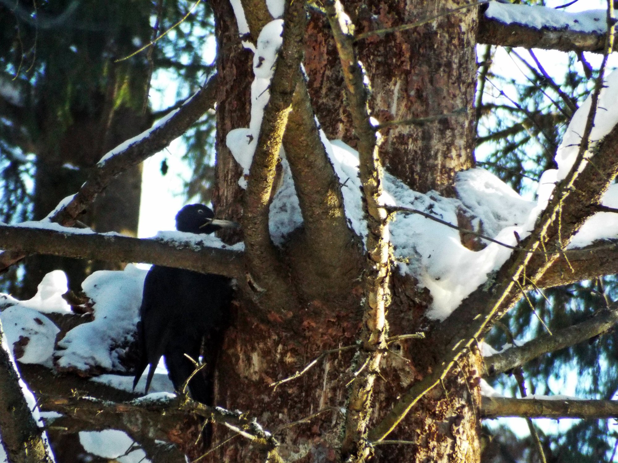 Во время лыжной прогулки по лесу услышала характерный для дятла звук. Присмотрелась и заметила эту черную птичку. Как потом оказалось, это черный дятел - желна.