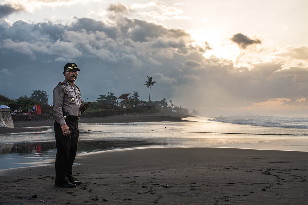 Полицейский на страже рассветного пляжа. Индонезия