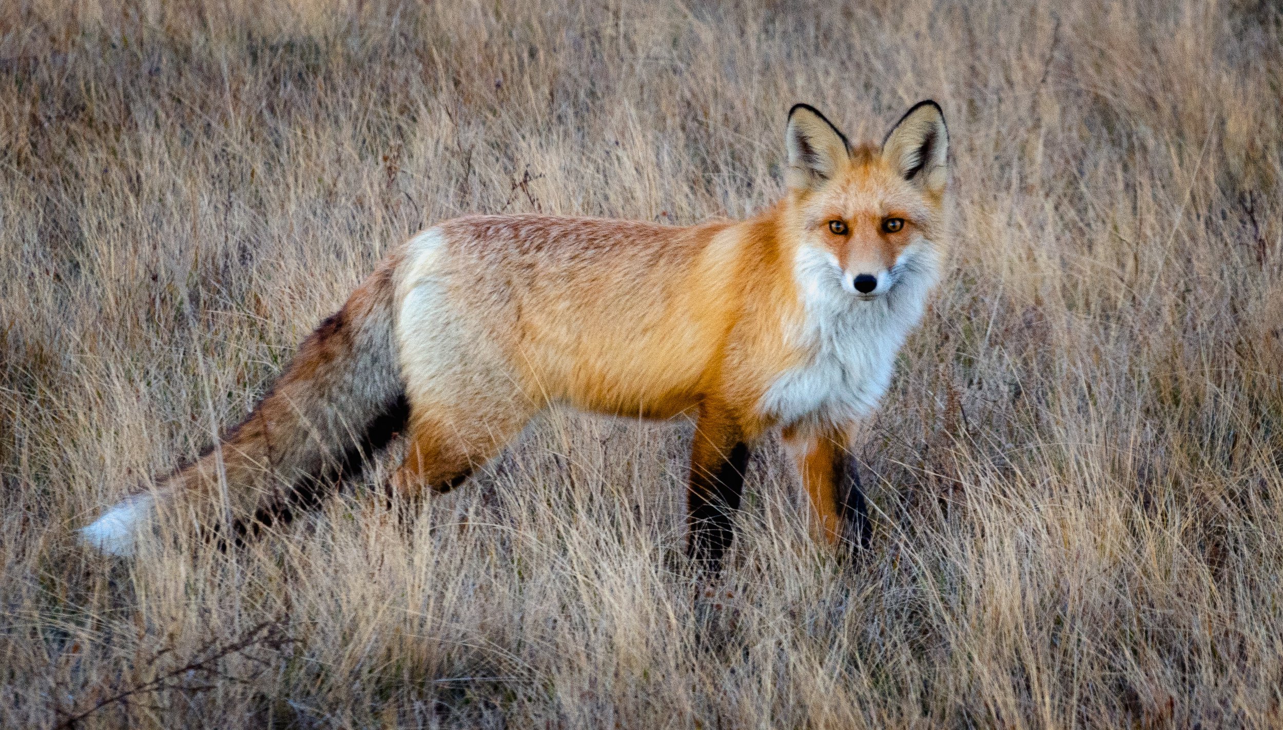 Проезжая по степям Хакасии, заметил мышкующую рыжую лисицу. Подъехав к ней, стал фотографировать в форточку двери. Лисица не убегала, более того, сама еще ближе подбежала. Сделав с десяток снимков, вышел из машины. Лиса не убегала, но и ближе пятнадцати метров к себе не подпускала. Вот на таком расстоянии еще минут десять позировала мне, затем побежала восвояси мышей ловить.