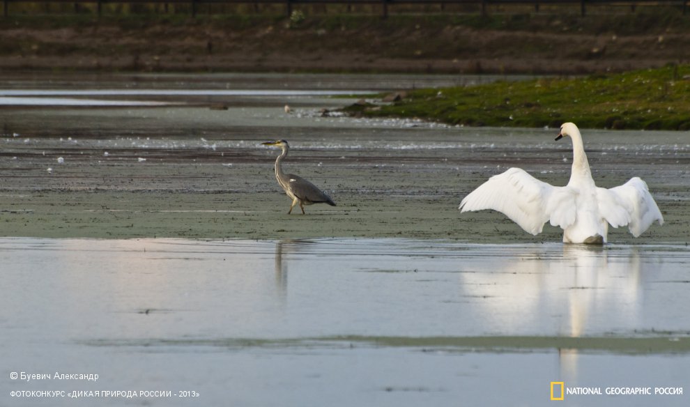 Лебедь-шипун долго провожал взглядом эту цаплю, медленно и гордо проходившую мимо. В какой-то момент он вдруг поднялся и расправил крылья, как-будто пытаясь привлечь внимание этой странной серой птицы. Цапля, даже не удостоив красавца мимолетным взглядом, перешла на другой край пруда. Челябинская область.