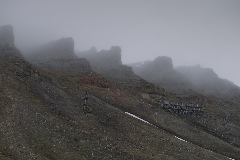 Непрочные горные породы Шпицбергена быстро разрушаются под действием воды и льда, образуя характерный зубчатый рисунок. На склоне - заброшенная угольная шахта.