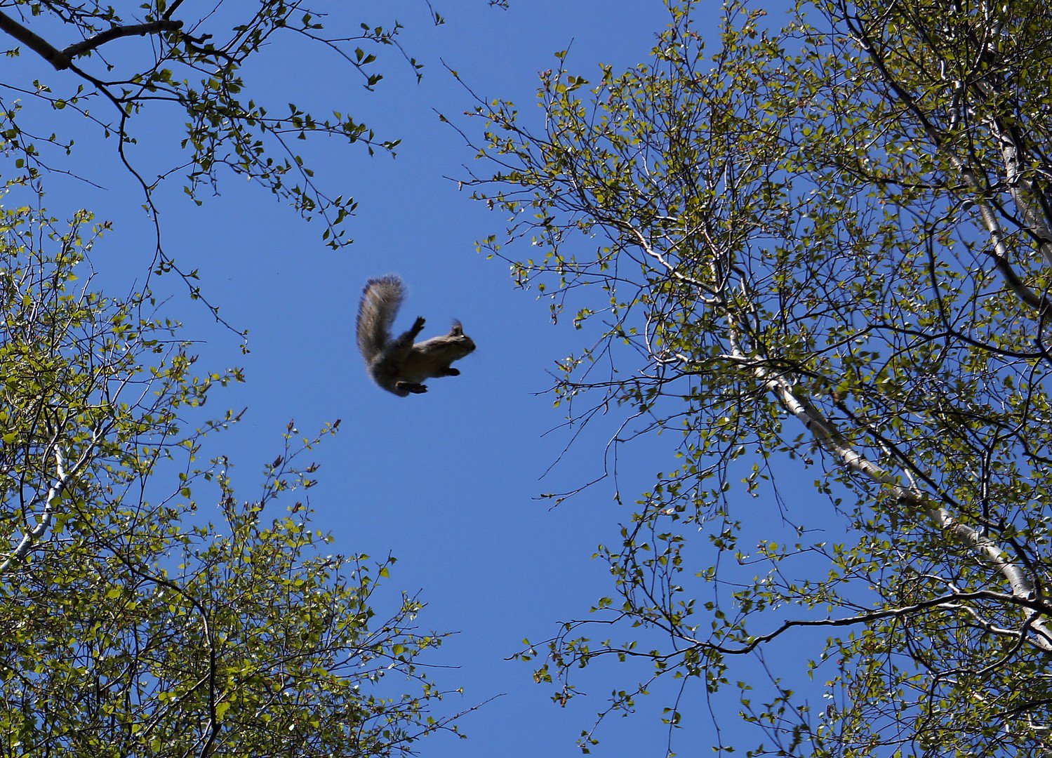Прогуливаясь по лесу, увидел как белка прыгает с дерева на дерево.