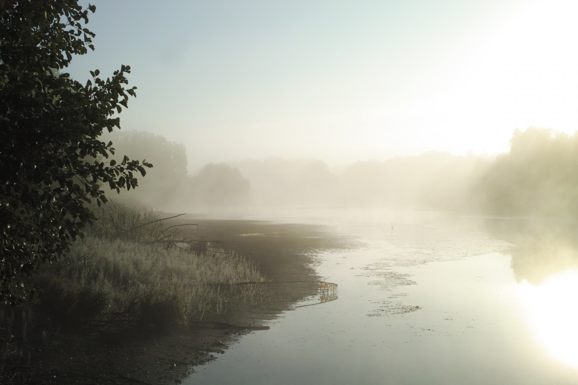 Туманный восход над обмелевшим из-за засухи берегом речушки Сухая Ватца.