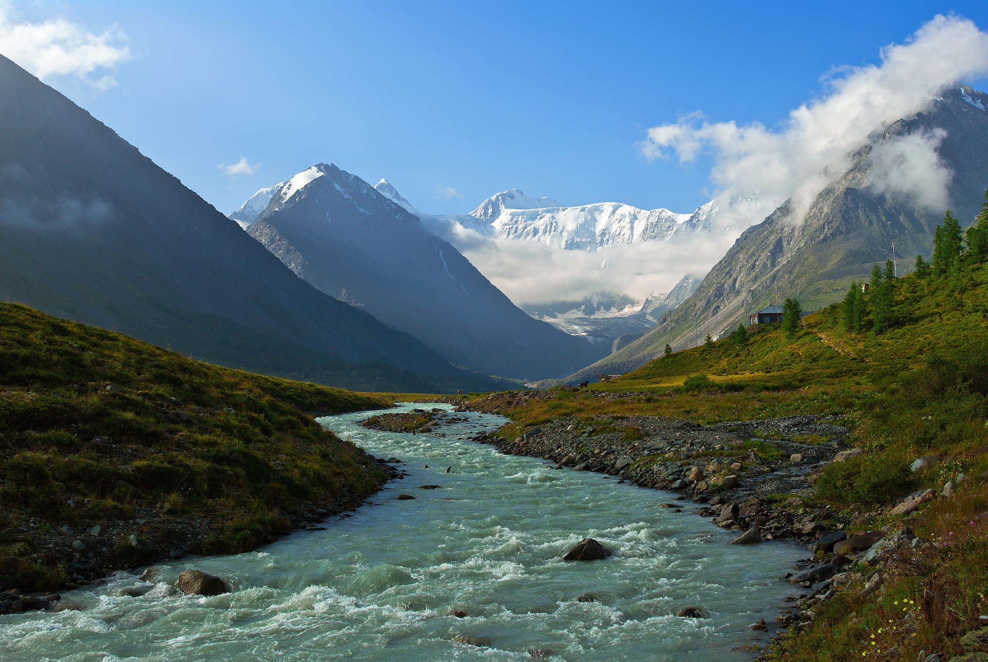 Алтай, самая высокая вершина Алтая - двуглавая красавица Белуха, р. Аккем (белая река).
