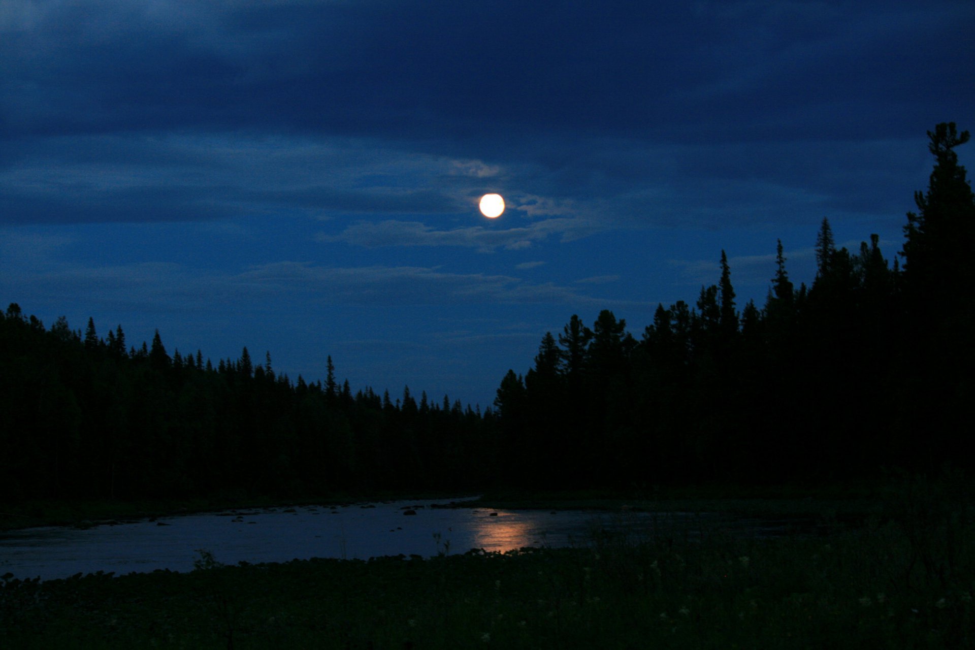 Полной луной освещена река и окрестности. В тишине тихое перекатывание воды по камушкам расслабляет и убаюкивает
