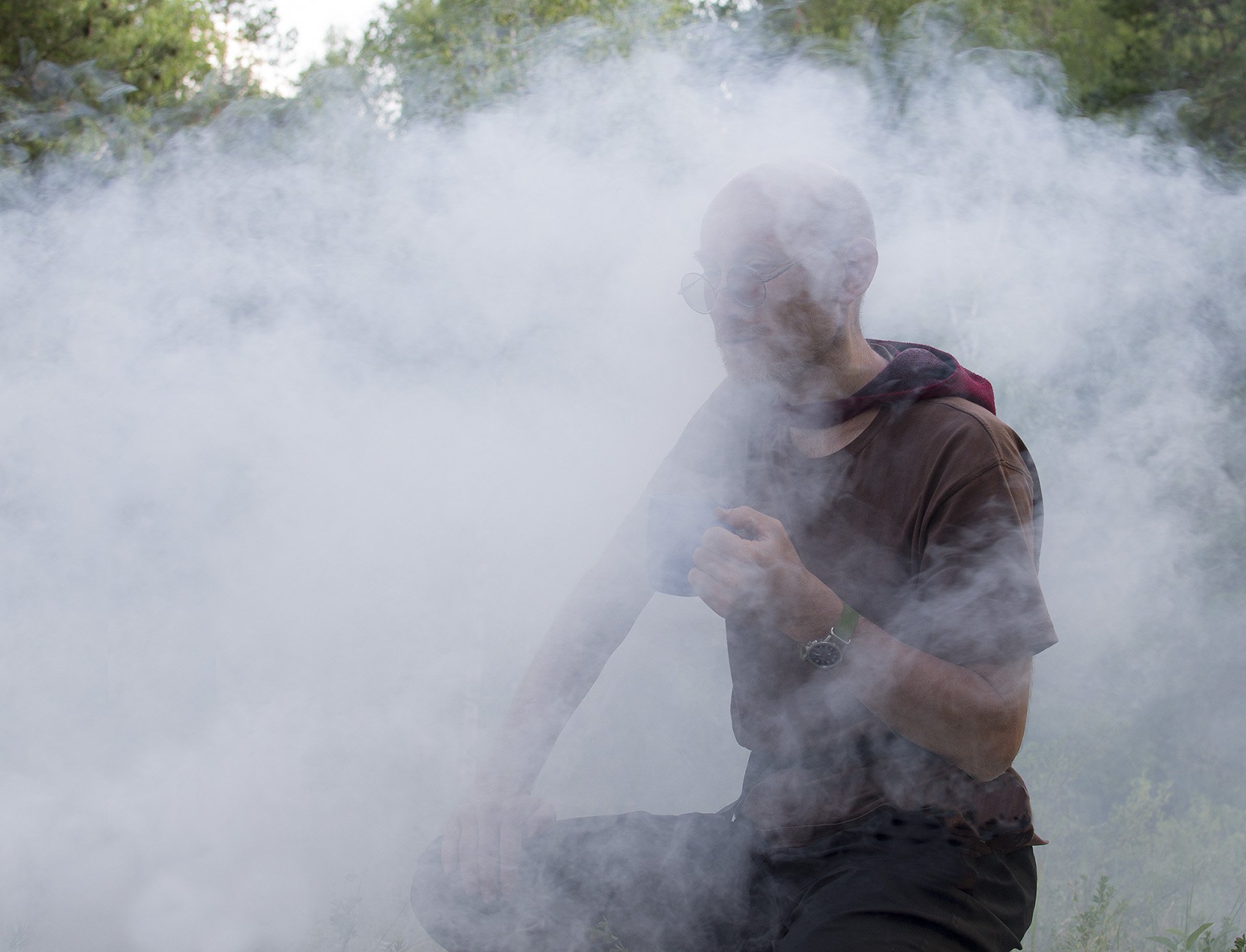 Неспешное чаепитие у дымного костра в лесу, как медитация. Это время только для себя.