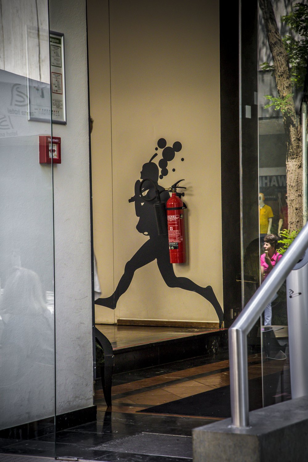 Креативный вариант висящего огнетушителя в Мюнхене.