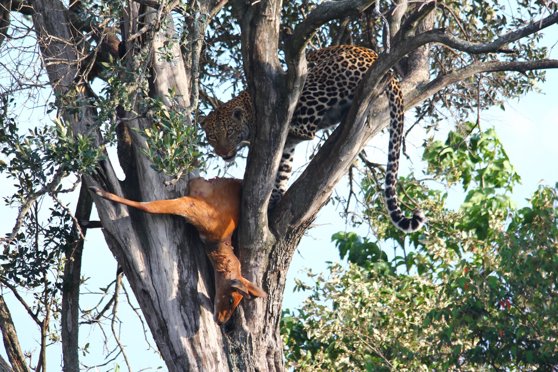 Леопарды ведут преимущественно ночной образ жизни, отсыпаясь днем в тени деревьев. Нам выпала большая удача встретить это животное за трапезой на вечернем сафари в заповеднике Масаи-Мара.
