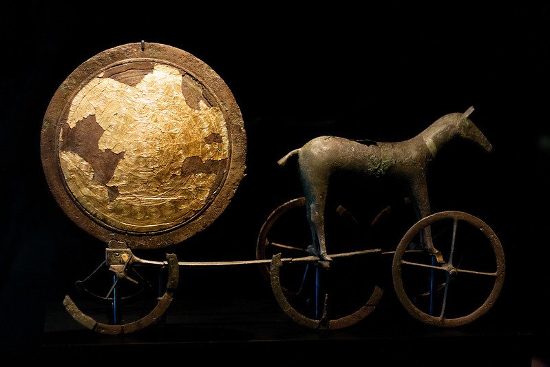 Позже она была реконструирована экспертами Национального музея Дании и явила миру настоящее сокровище бронзового века: коня, впряженного в четырехколесную повозку и тянущего за собой позолоченный с одной стороны диск, напоминающий солнце. В высоту статуэтка достигала 35 сантиметров, а в длину – 54 сантиметра.