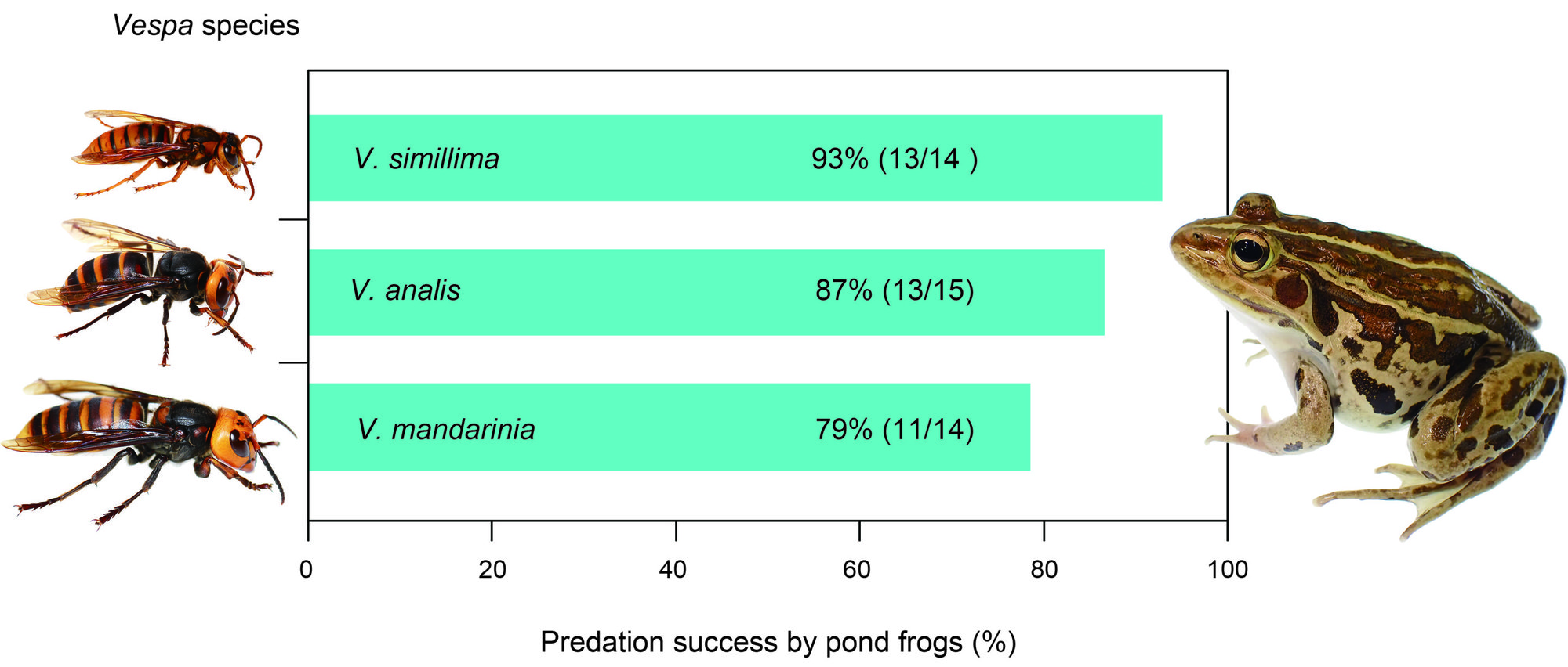 Исследователи из Университета Кобе в Японии обнаружили, что обычная чернопятнистая лягушка (лат. Pelophylax nigromaculatus) способна поедать даже самых опасных шершней и при этом практически не страдать от их укусов и яда. Руководил работой биолог Синдзи Сугиура, который изучает взаимодействие насекомых и их природных врагов.