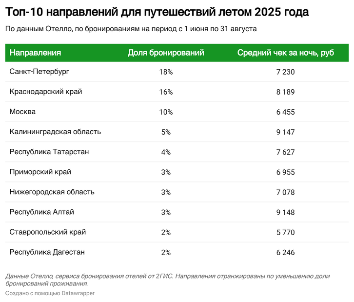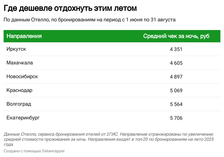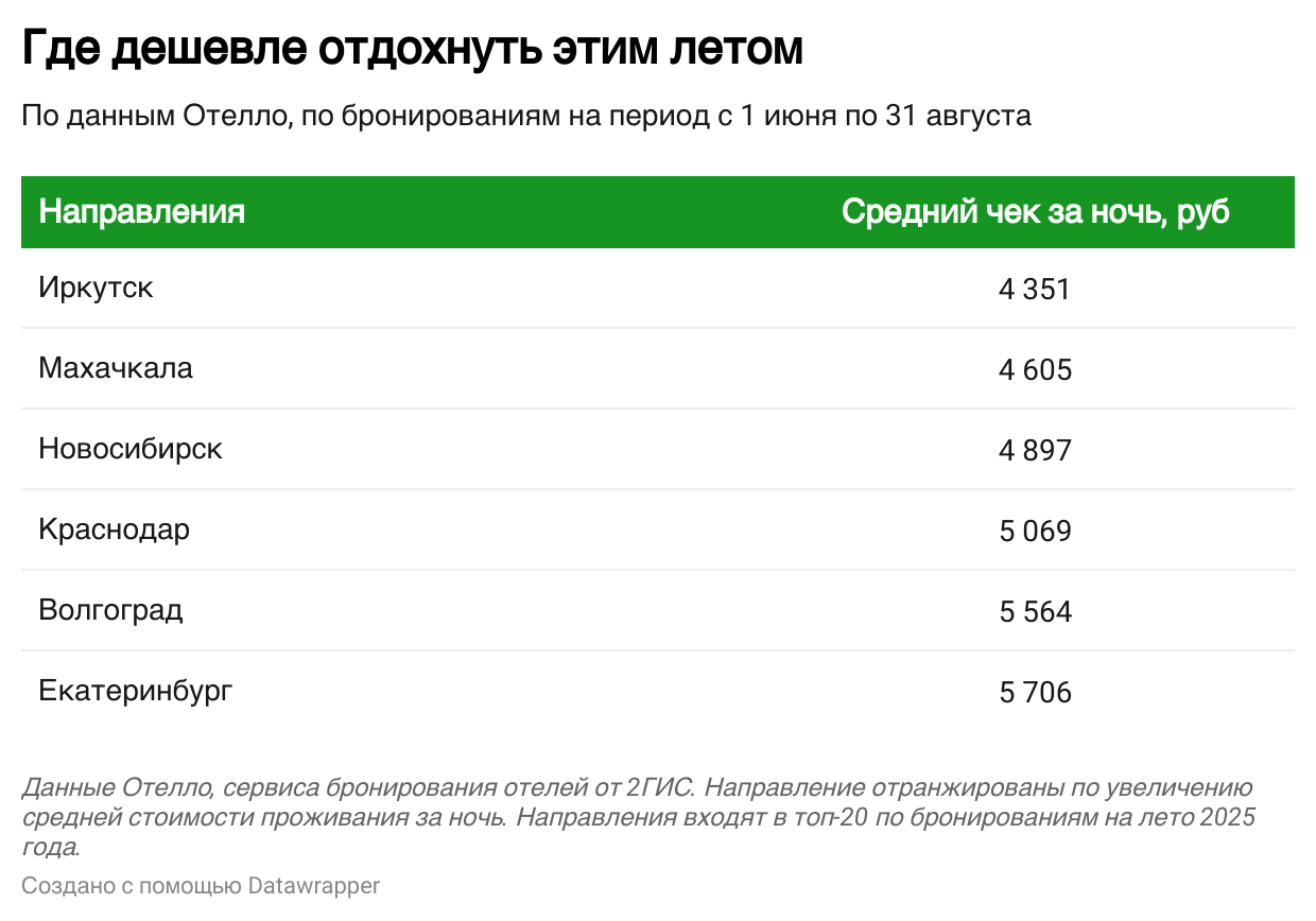 Из российских направлений самым желанным этим летом по количеству бронирований оказался Санкт-Петербург, а самым бюджетным Иркутск – одна ночь в среднем обойдется здесь туристам в 4 351 рубль.