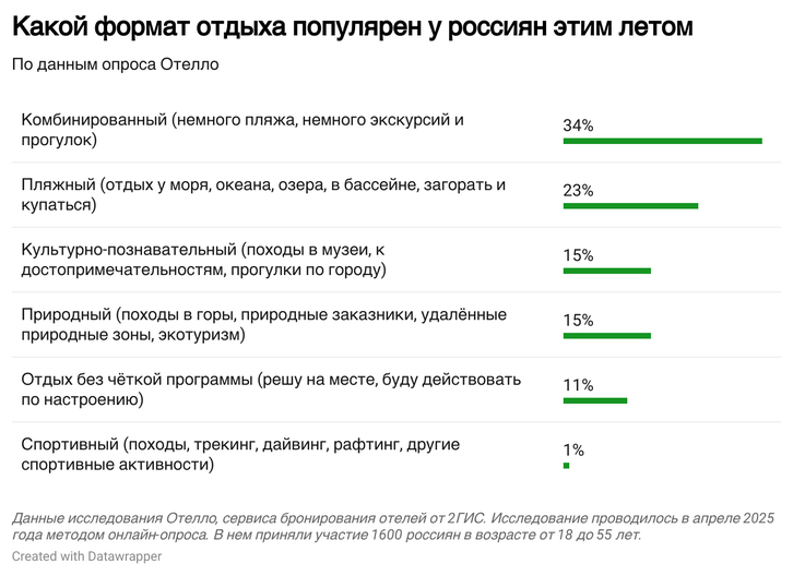 Данные онлайн-опроса взрослых россиян в возрасте до 55 лет показали, что такой формат предпочитают 34% опрошенных, а вот 23% респондентов хотели бы провести свой отпуск исключительно на пляже. Самым непопулярным типом отдыха оказался спортивный туризм: этим летом им будет заниматься лишь 1% опрошенных.