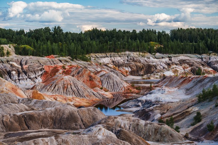 Наконец мы на месте. Пейзаж поистине инопланетный: глиняная пустошь всех оттенков охры, красного и коричневого, испещренная кратерами и холмами. Вода в небольших озерцах переливается от небесно-голубого до багряного. HAVAL H9 на фоне этих неземных ландшафтов смотрится как исследовательский ровер, готовый к покорению новой планеты. Здесь, среди «марсианских» просторов, особенно остро ощущается вечность материала, с которым работает наш герой.