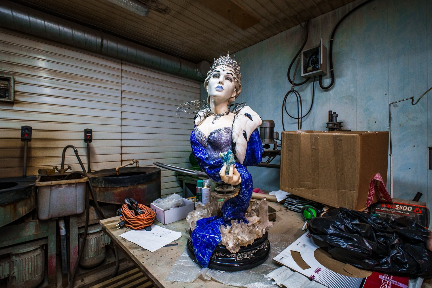 Главная проблема больших каменных фигур – ювелирное качество, которое нужно масштабировать под большой размер. Ценные камни редко бывают крупными, их нельзя просто нарастить друг на друга. Алексей придумал каркасную технологию, которая позволяет собирать сложные фигуры из множества каменных и металлических элементов, сохраняя безукоризненную геометрию и чистоту швов. Это действительно искусство: тончайшие детали, сборка под микроскопом — и при этом масштаб, поражающий воображение.