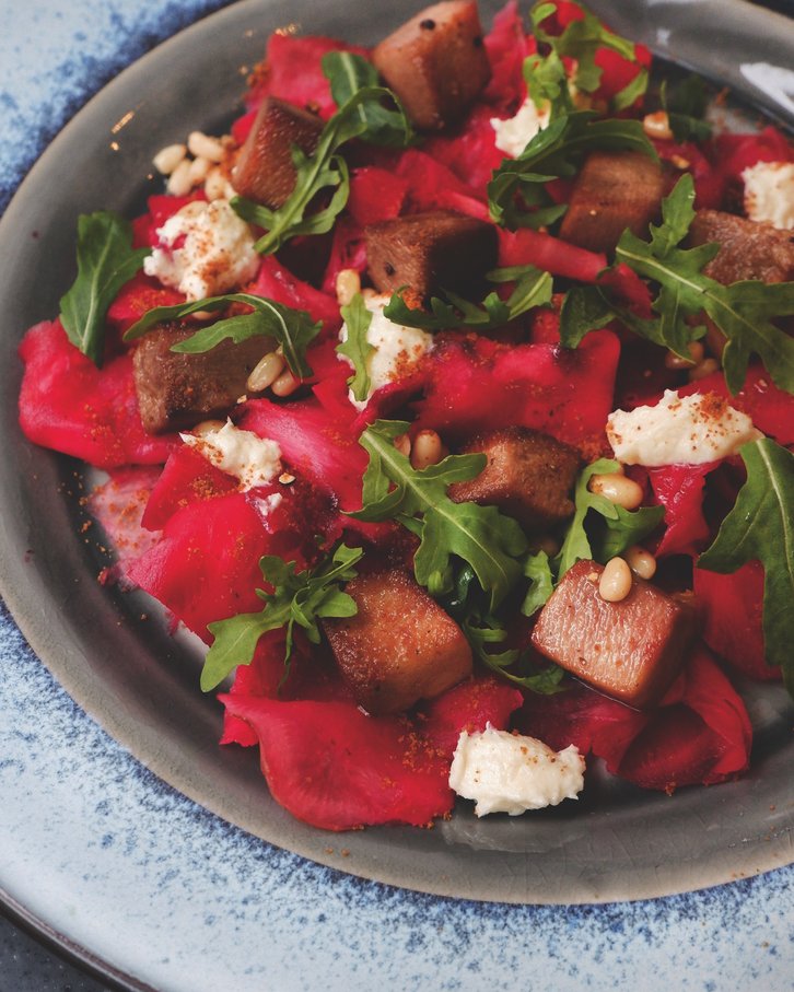 Нам же шеф предлагает приготовить нарядный новогодний салат с сельдереем. Его белый корень запекают в печи, нарезают слайсами, погружают в свекольный фреш, доведённый до вкуса солью и лимонным соком, и дают промариноваться. Нарезают кубиками и поджаривают отварной говяжий язык. Из мягкого сыра и тёртого хрена делают кнели. Собирают салат с зеленью и посыпают его поджаренными подсолнечными семечками.