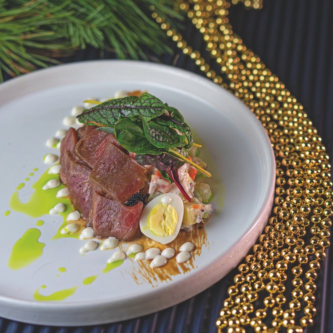 «На нашем новогоднем столе всегда есть донская селёдка, сельдь под шубой, оливье – мы готовим его с языком и донскими раками, – рассказывает Максим Артюхов, бренд-шеф ростовского бутик-отеля «39». – Также готовим курники – не большие пироги, а маленькие, порционные: собираем их из блинчиков, начиняем судаком и шампиньонами, добавляя укроп, сметану и чуть-чуть чеснока, и запекаем». По словам шефа, Новый год не обходится без осетрины и других рыбных закусок – например, фаршированной щуки и вяленого цимлянского леща.